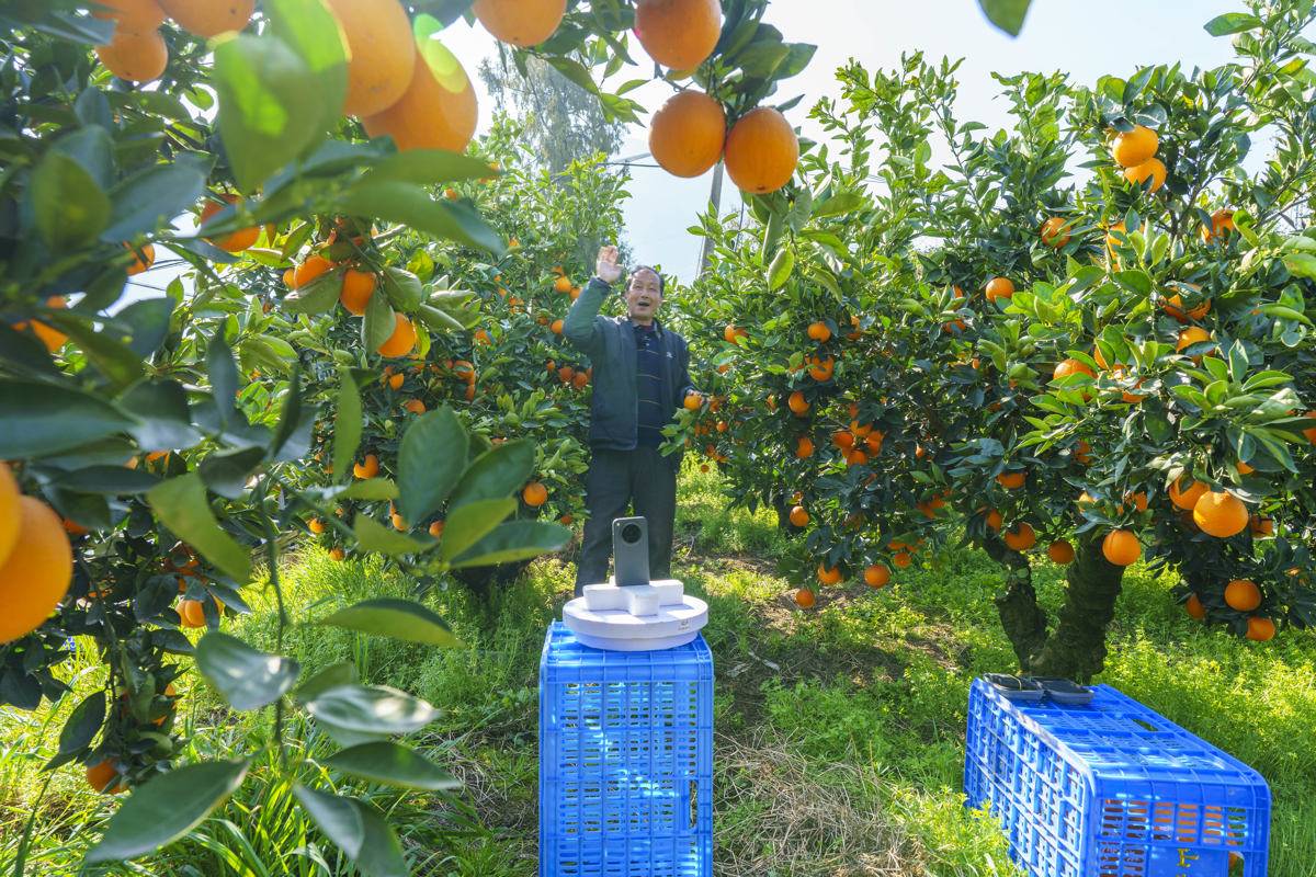 秭归县郭家坝镇王家岭村70岁的周功寿在伦晚园中直播卖橙。 周仕伟 摄