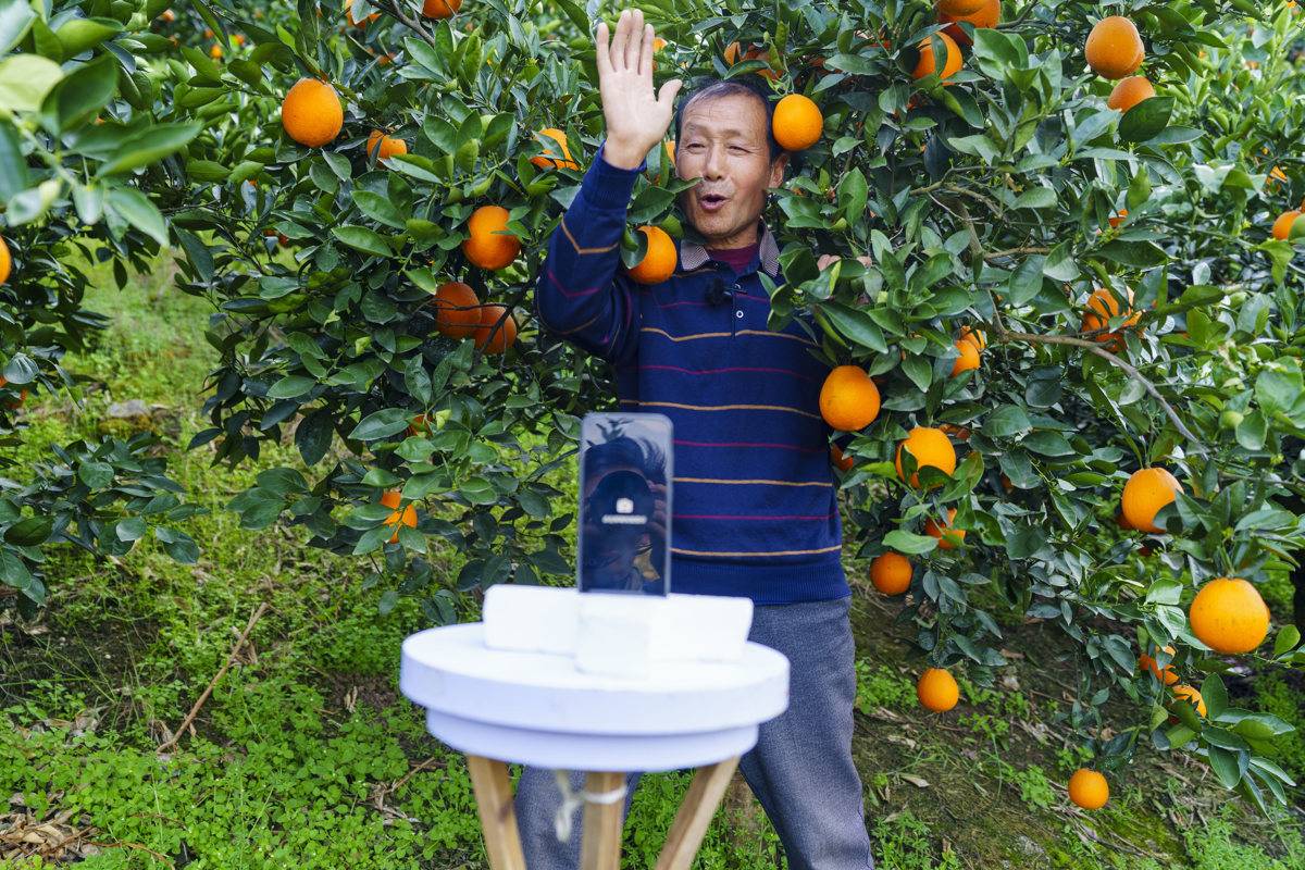 秭归县郭家坝镇王家岭村70岁的周功寿不依颜值靠品质直播卖橙。 周仕伟 摄