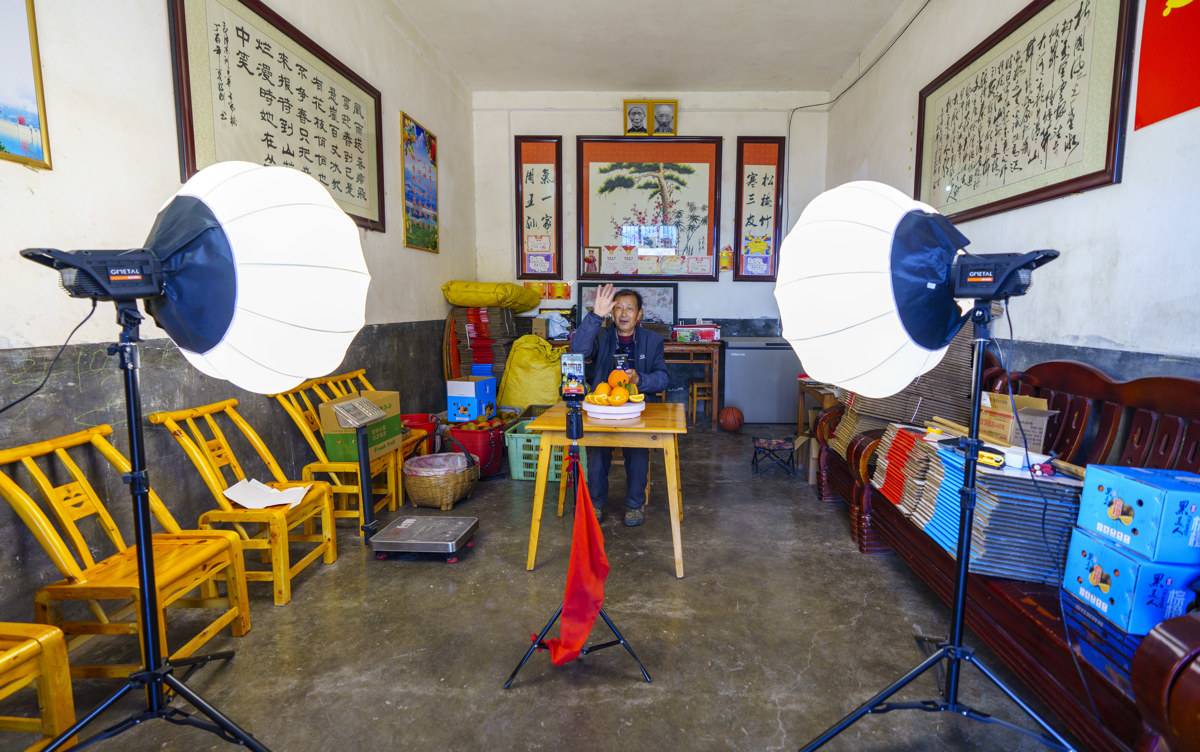 循声而去,70岁的周功寿正对着手机镜头手舞足蹈。他的设备颇显“寒酸”:三根木棍绑个转盘,托着一块泡沫板当手机支架。就是这套“土味装备”,在过去一年,帮他卖出近10万元脐橙。