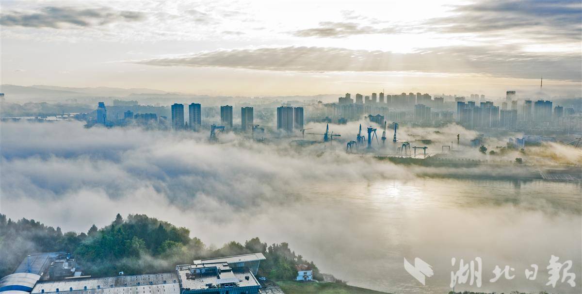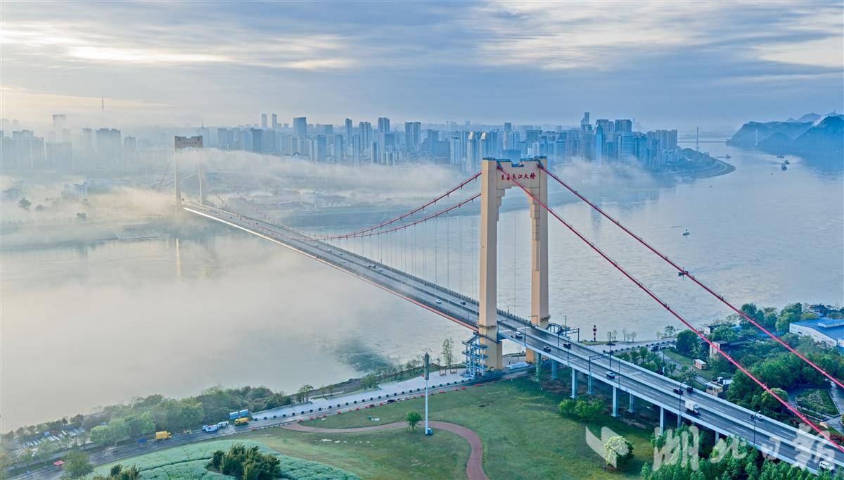 4月12日清晨,连日降雨后的宜昌城区云雾缭绕,空气清新。城区地标至喜长江大桥在薄雾与水汽中若隐若现,桥身与江面相映成趣,呈现出如梦似幻的水墨意境,成为雨后江城一道独特的风景线。(湖北日报全媒记者 刘曙松 摄)