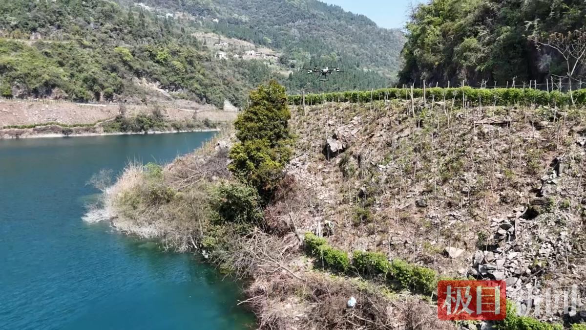 在清江隔河岩库区饮用水水源地,工作人员已完成岸线清理,施工单位正利用无人机调运土包,到处都是工人们栽植树木的繁忙身影。库岸沿线新种的乔木、灌木错落有致,形成一道生态屏障。