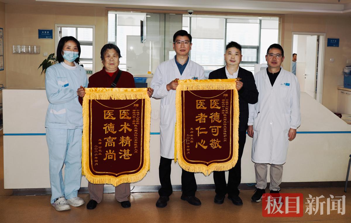 4月13日上午,湖北十堰市人民医院神经内科I病区的医护人员正忙着查房、交接病情,护理站前突然热闹起来——75岁的付奶奶和病友麻先生不约而同地出现了,手里各捧着一面鲜红的锦旗,笑盈盈地往科主任陈光辉手里塞。