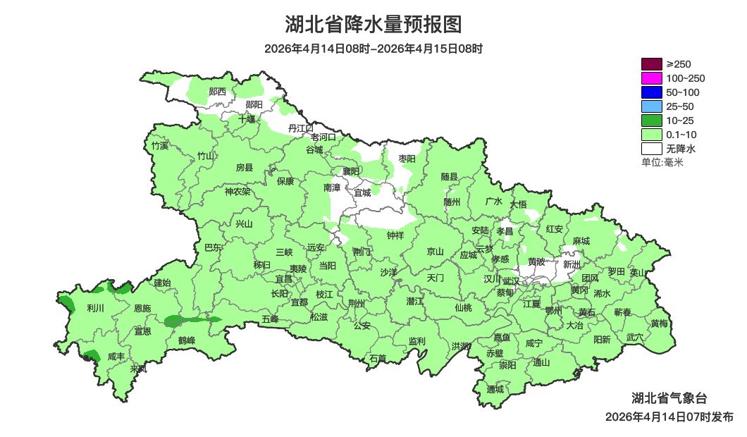 4月14日08时-15日08时,鄂西南阴天有小雨,局地中雨;其他地区短时小雨转多云。夜间到早晨省内局地有雾。最高气温19~24℃,最低气温13~15℃,偏北风2到3级。