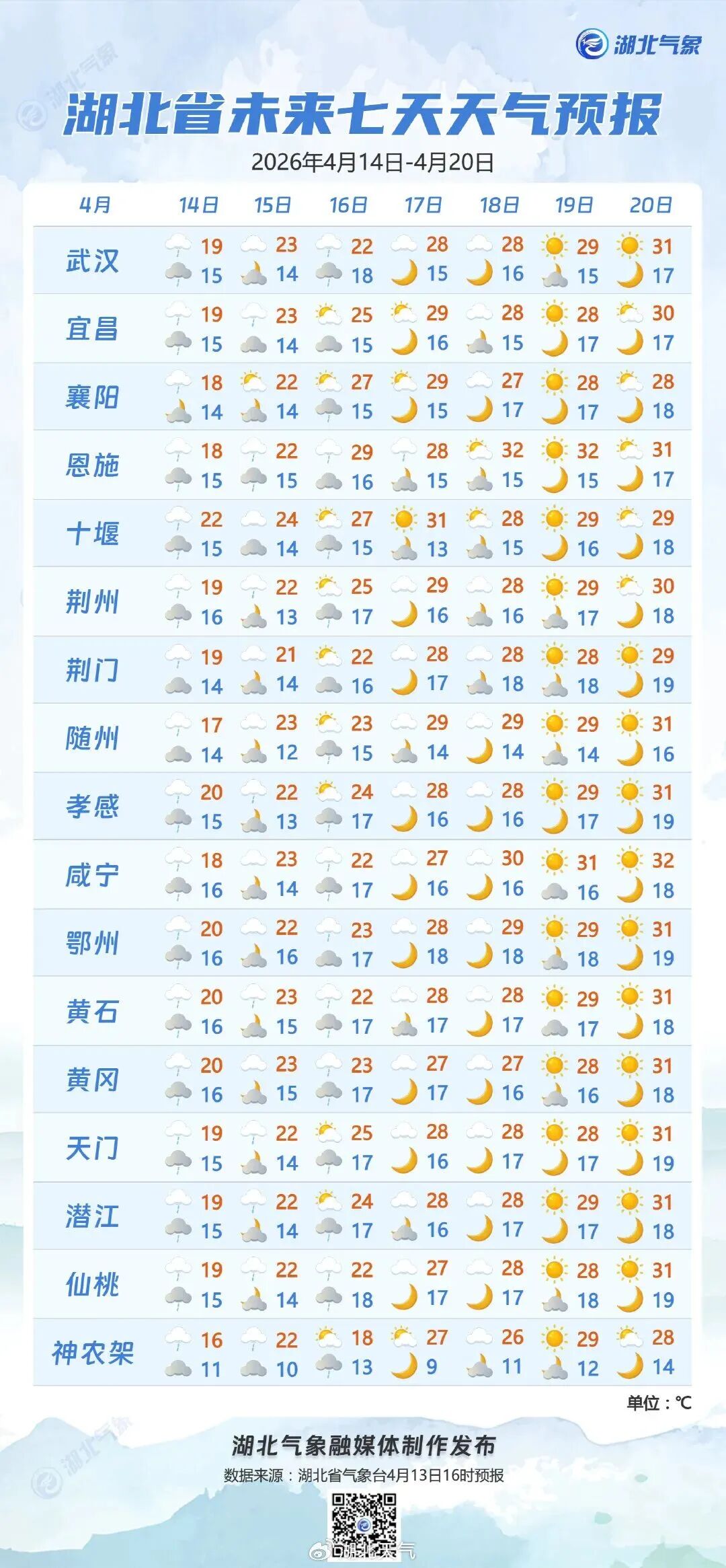 4月16日08时-17日08时,鄂西南南部、江汉平原南部、鄂东南、鄂东北东部短时小雨转多云;其他地区多云到晴天。最高气温中西部24~29℃、东部21~24℃,最低气温西部10~15℃、中东部13~17℃,偏北风2到3级、阵风4到5级。