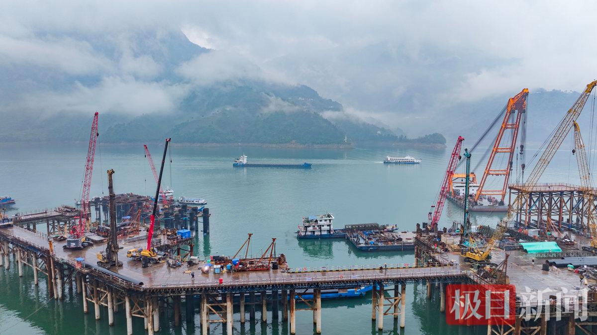 4月13日,微雨淅沥,三峡库区秭归县茅坪镇太平溪水道右岸,三峡枢纽江南成品油翻坝项目坝上码头工程施工现场,一派热火朝天的繁忙景象。