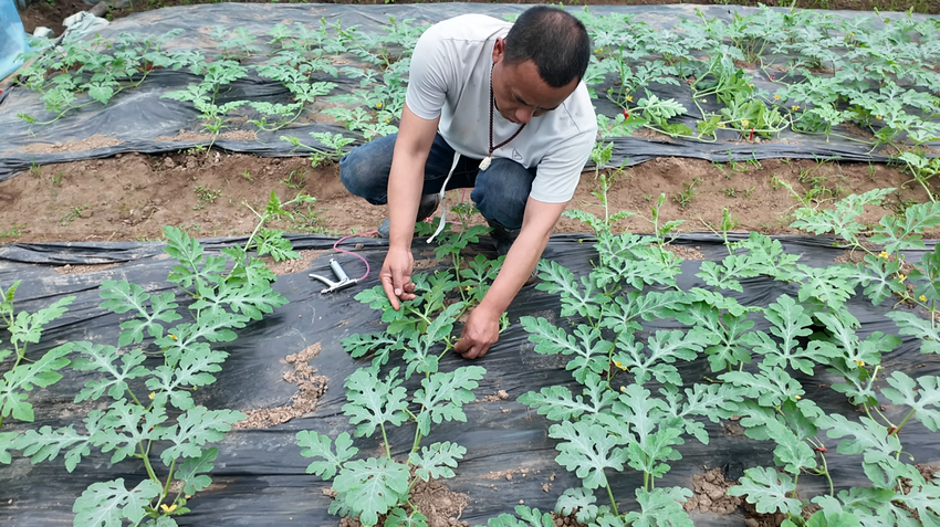 与圣女果大棚毗邻的20个西瓜种植大棚内,翠绿的瓜蔓贴着地面舒展铺开,小西瓜藏在藤叶之间,长势十分喜人。工人们正抢抓晴好天气开展春季田间管护:有的蹲在垄沟旁,细致地为瓜蔓喷施帮助坐果的药液;有的弯腰俯身,熟练地摘除多余枝杈和侧蔓,为西瓜优质生长留足养分空间。