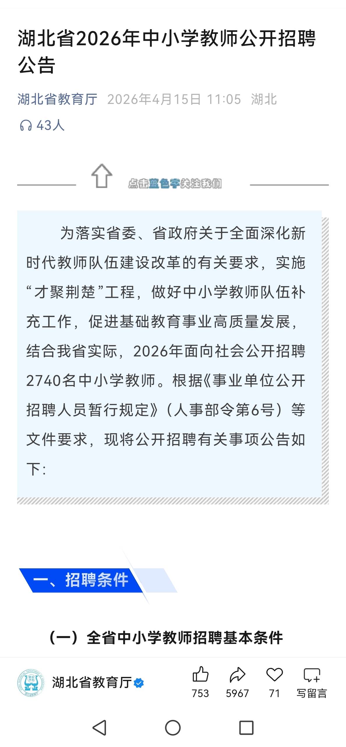 湖北日报讯(记者陈熹、通讯员梁炜)4月15日,湖北省教育厅发布公告,2026年面向社会公开招聘2740名中小学教师。报名工作将于4月16日9:00正式启动,4月22日17:00截止,笔试统一安排在5月10日举行。