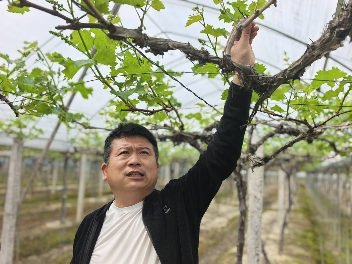 棚内,葡萄藤蔓葱郁。这片200多亩种植基地的主人黄铁强,操着浙江口音的普通话,正指导工人整枝管护。