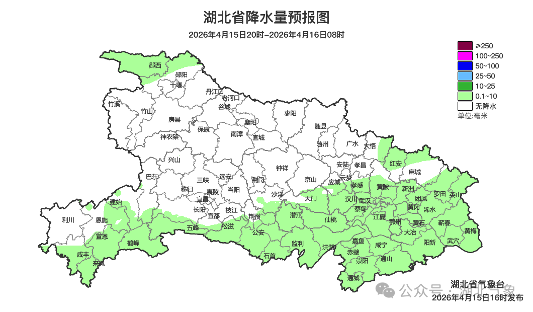 4月15日20时-16日08时,鄂西南、江汉平原南部、鄂东北东部、鄂东南阴天有小雨;其他地区阴天间多云,局地有短时小雨。最低气温14~17℃,偏北风2到3级。