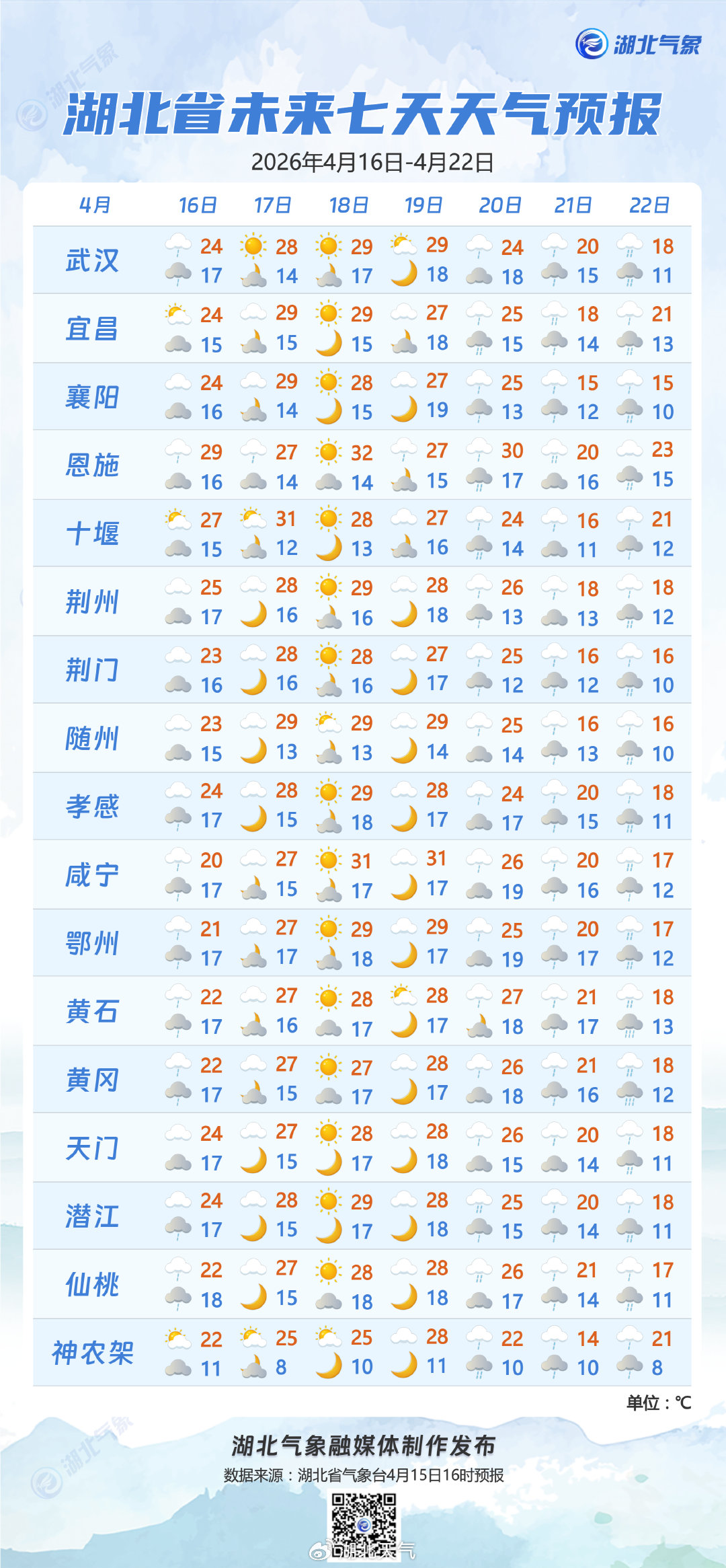 4月16日08时-17日08时,鄂西南南部、江汉平原南部、鄂东北东部、鄂东南小雨,局地中雨转多云;其他地区多云。最高气温中西部24~29℃、东部21~24℃,最低气温西部10~14℃、中东部14~17℃,偏北风2到3级。