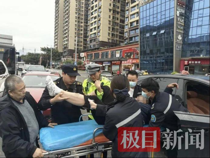 正在附近巡查的金子坝街道综合执法中心工作人员华友财、姜志威听到异响后,立即奔向事发地点。华友财透过车窗查看伤者状况,同时拨通了120。前车司机也找来一把安全锤。