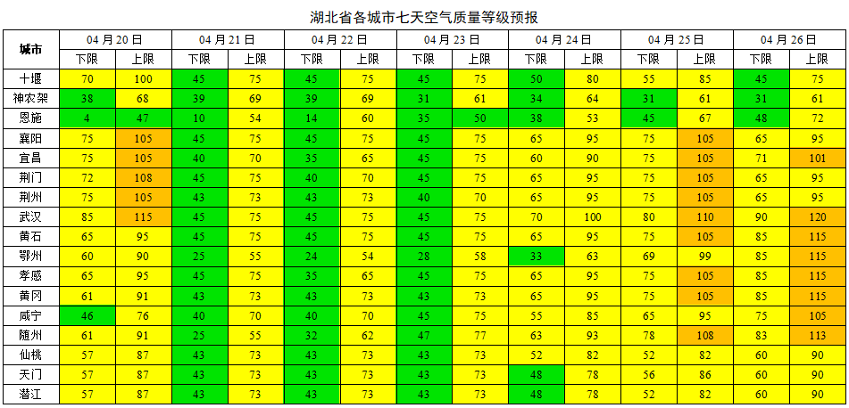 湖北日报讯(记者刘郸、通讯员李斌)4月20日,湖北省生态环境监测中心站、湖北省气候中心发布最新空气质量预测:本周(4月20—26日)预计20—22日白天我省继续降雨降温,23日至26日以晴到多云为主,气温逐步回升,周后期臭氧污染气象风险升高。