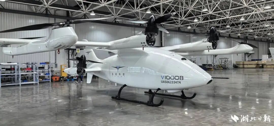 这是由武汉迅起科技有限公司(以下简称武汉迅起科技)自主研发生产的V1000货运型,也是国内首款获得民航局TC(型号合格证)受理的大型倾转旋翼混动eVTOL。