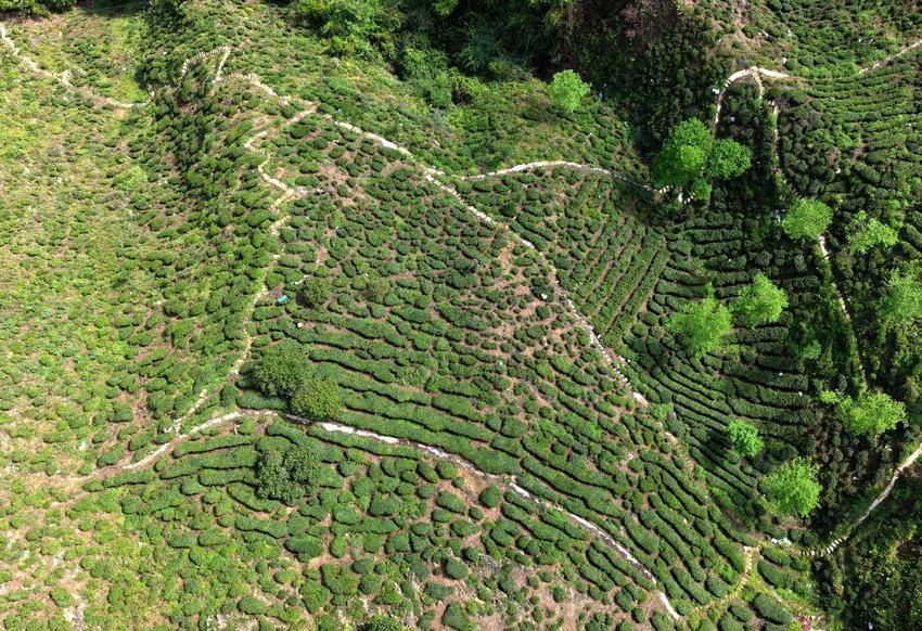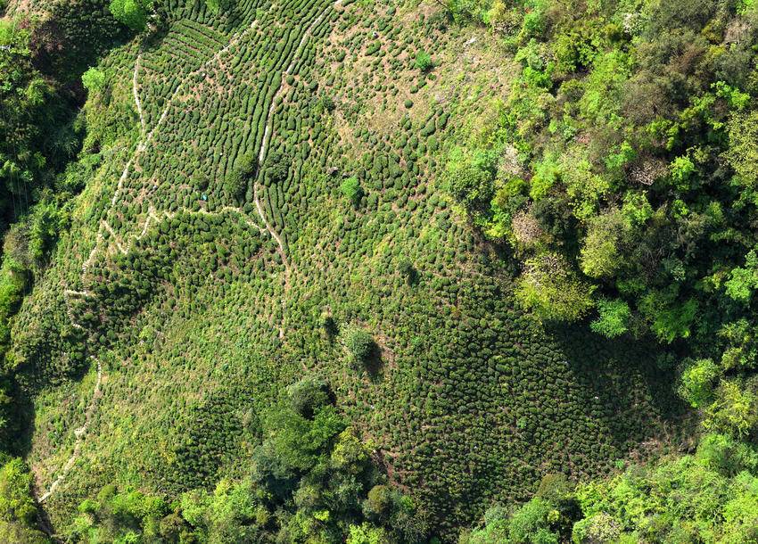 4月15日,在湖北省秭归县屈原镇凤凰溪村拍摄的野生茶园(无人机照片)。