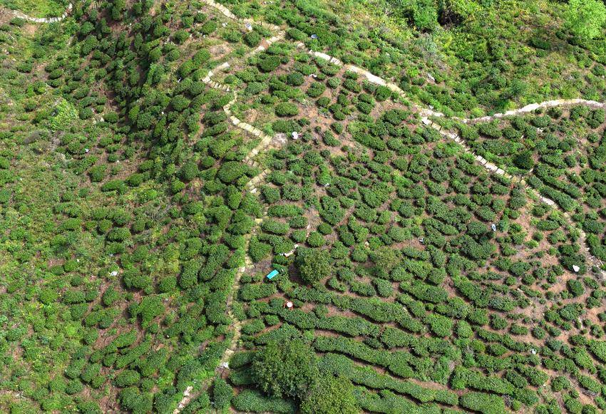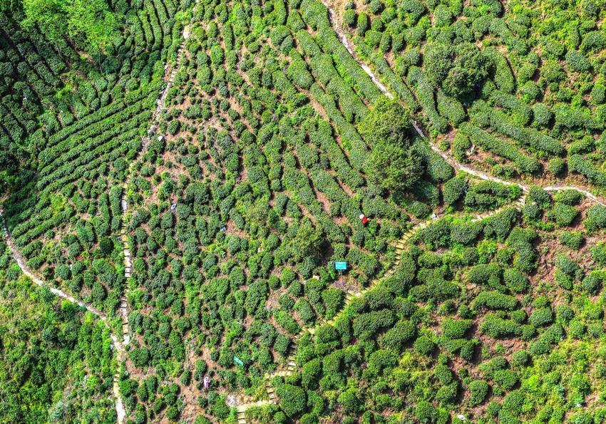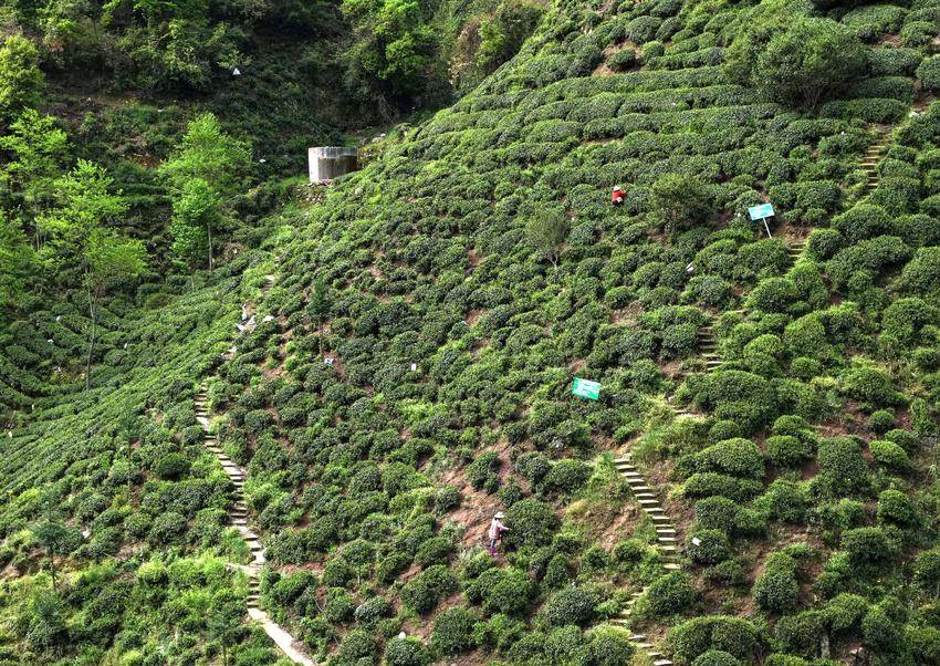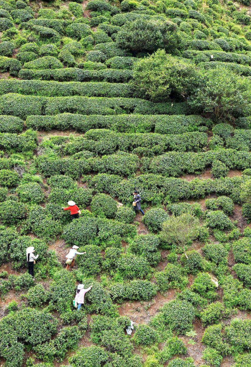 4月15日,湖北省秭归县屈原镇凤凰溪村茶农在茶山采摘野茶(无人机照片)。