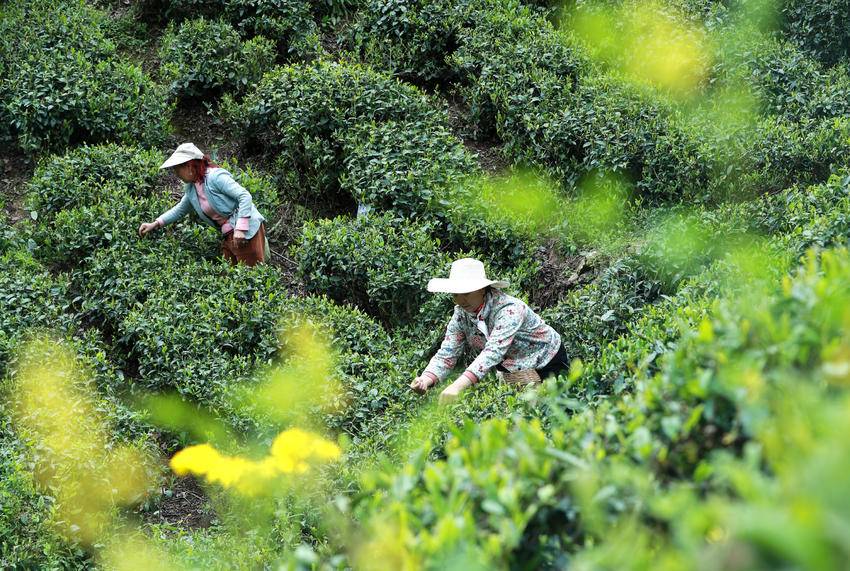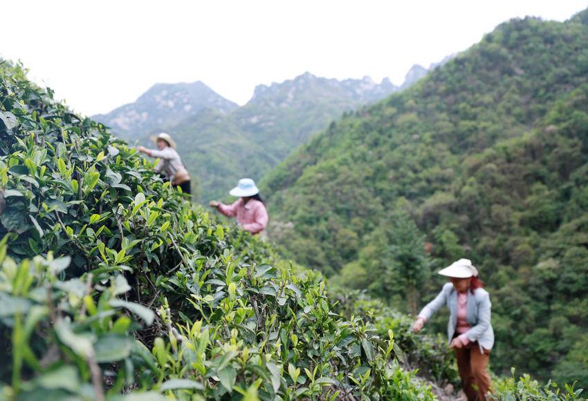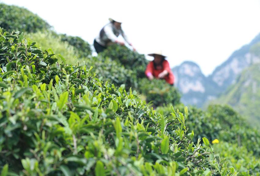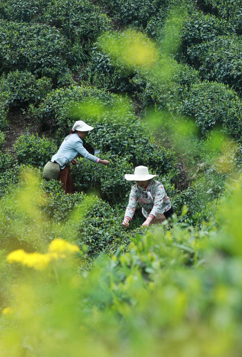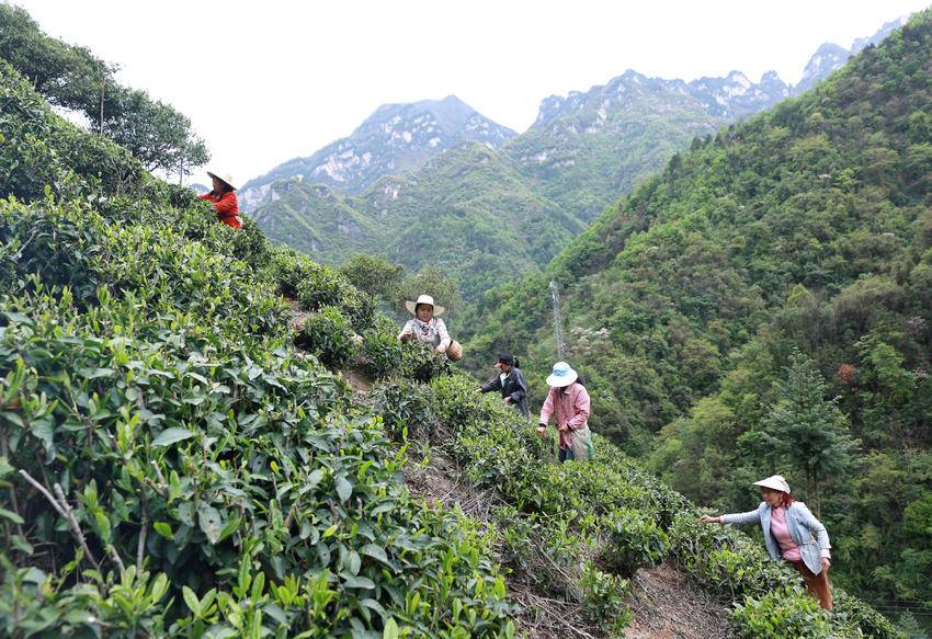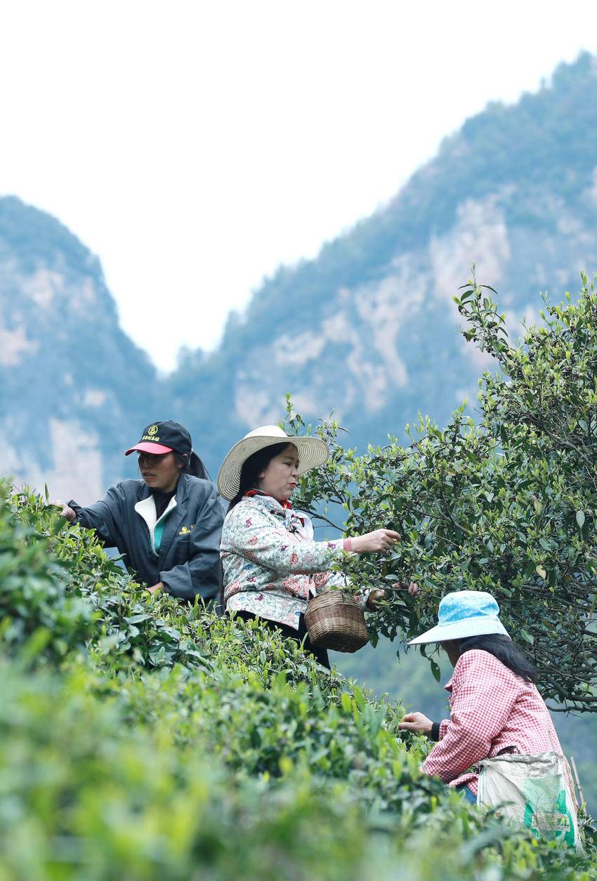 4月15日,湖北省秭归县屈原镇凤凰溪村茶农在茶山采摘野茶。