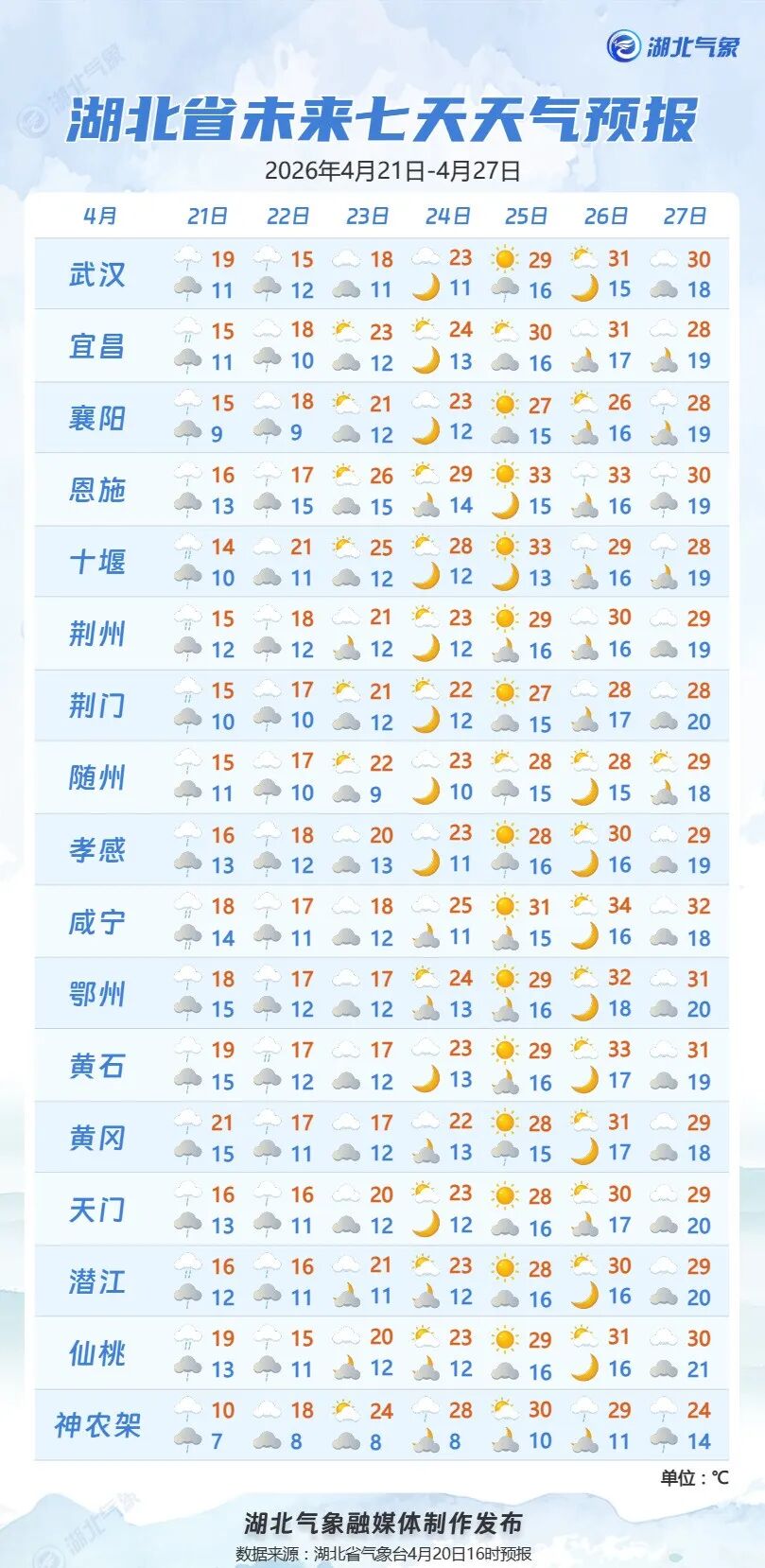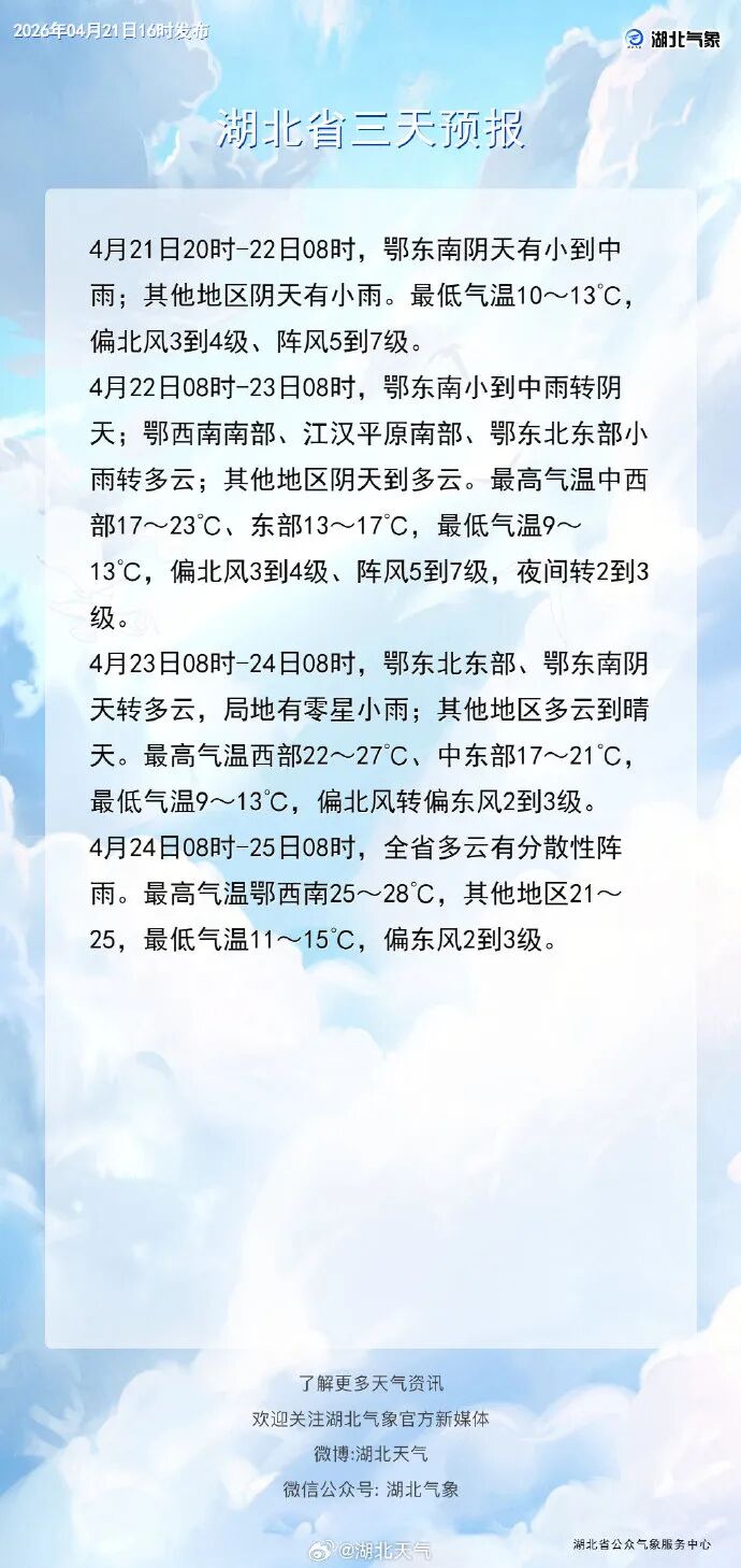 【天气提示】明天(4月22日)起,降雨逐渐减弱、结束,气温开始止跌回升,后天(4月23日)全省大部天气转好,适合洗衣晾晒或外出旅游。周五(4月24日),省内部分地区有分散性阵雨,出行注意携带雨具。