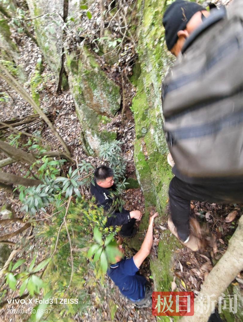 时间一分一秒流逝,山路愈发险峻。经过近三小时的紧张搜寻,8时10分左右,一声微弱的回应终于从一处陡峭崖壁下方传来——“我在这里!”