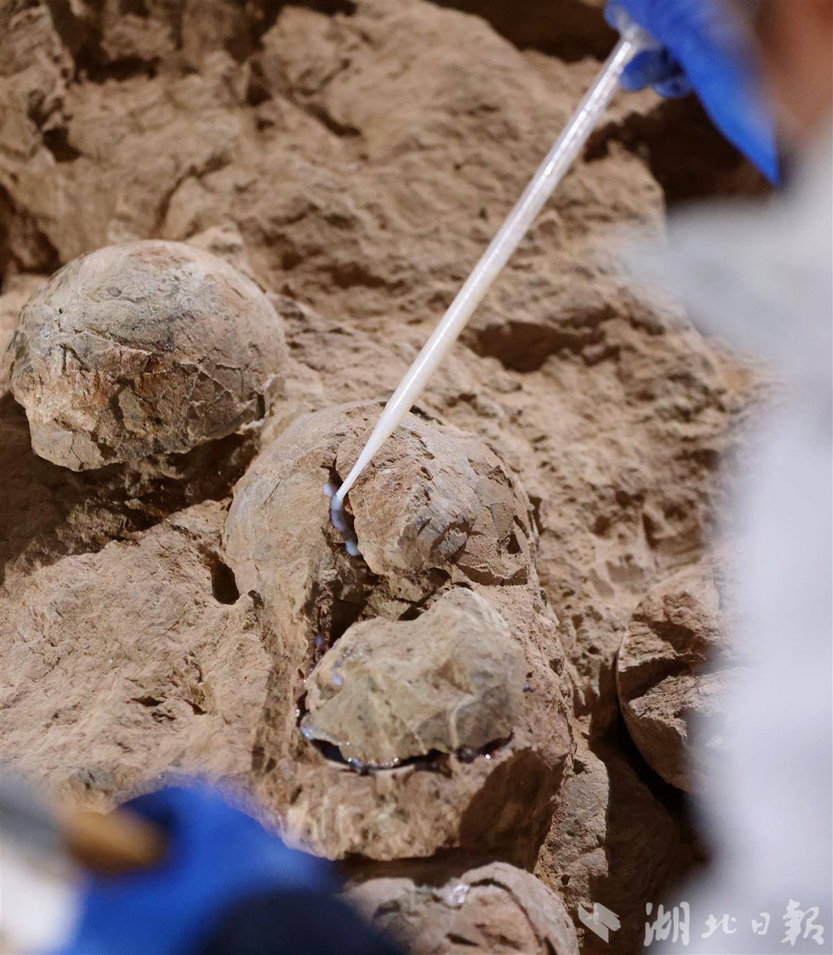 工作人员将乳液滴入恐龙蛋化石裂痕使其固化。(通讯员 全正 摄)