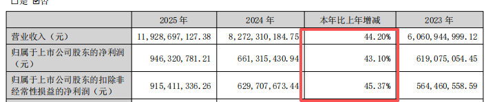 2025年,光迅科技全年营收达119.29亿元,同比增长44.20%;归母净利润9.46亿元,同比增长43.10%。