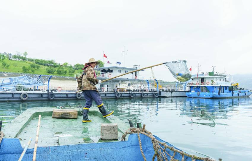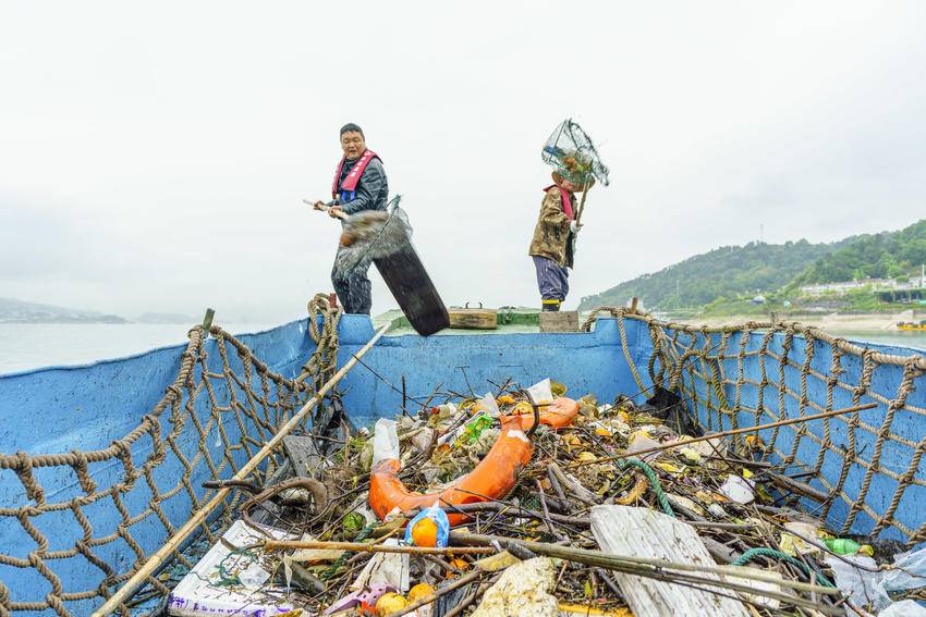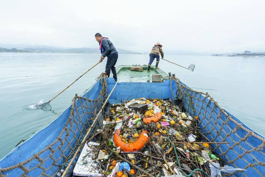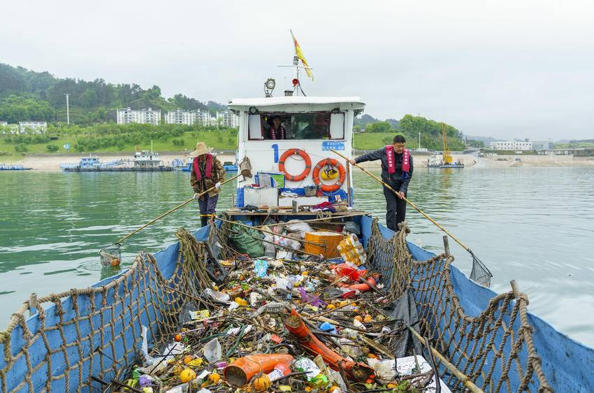 4月21日,湖北省宜昌市秭归县三峡库区,清漂队员正在打捞江面漂浮物。