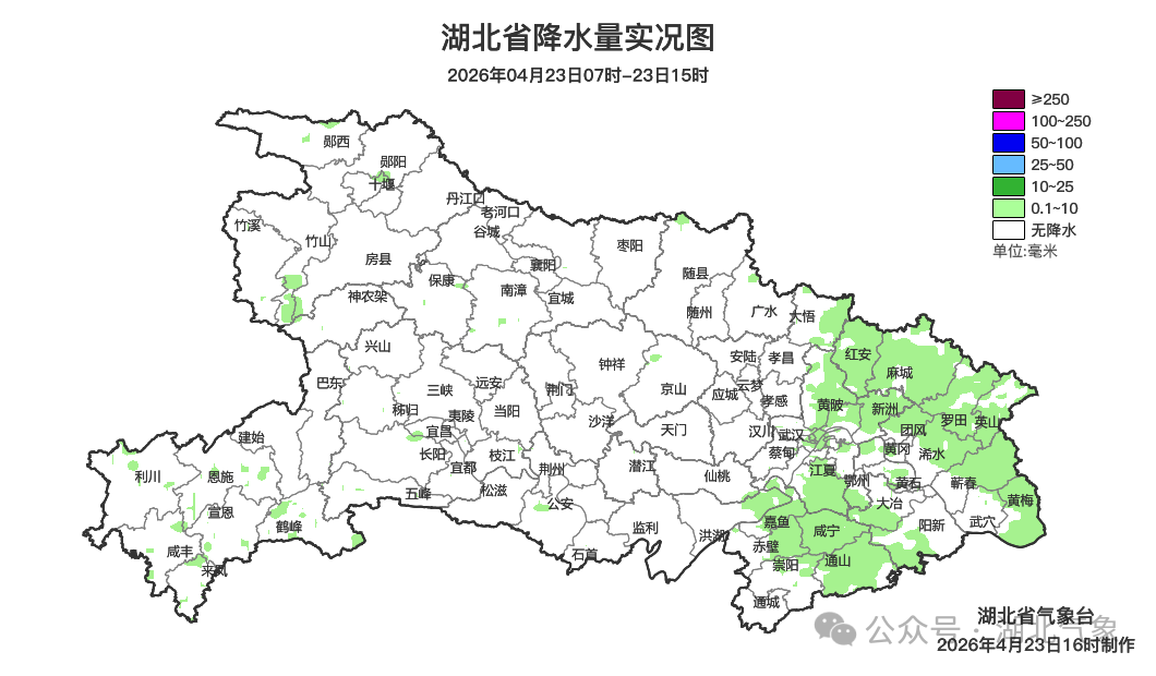 4月23日20时-24日08时,鄂东北、鄂东南阴天转多云;其他地区多云到晴天。早晨省内局地有雾。最低气温9~12℃,偏东风2到3级。