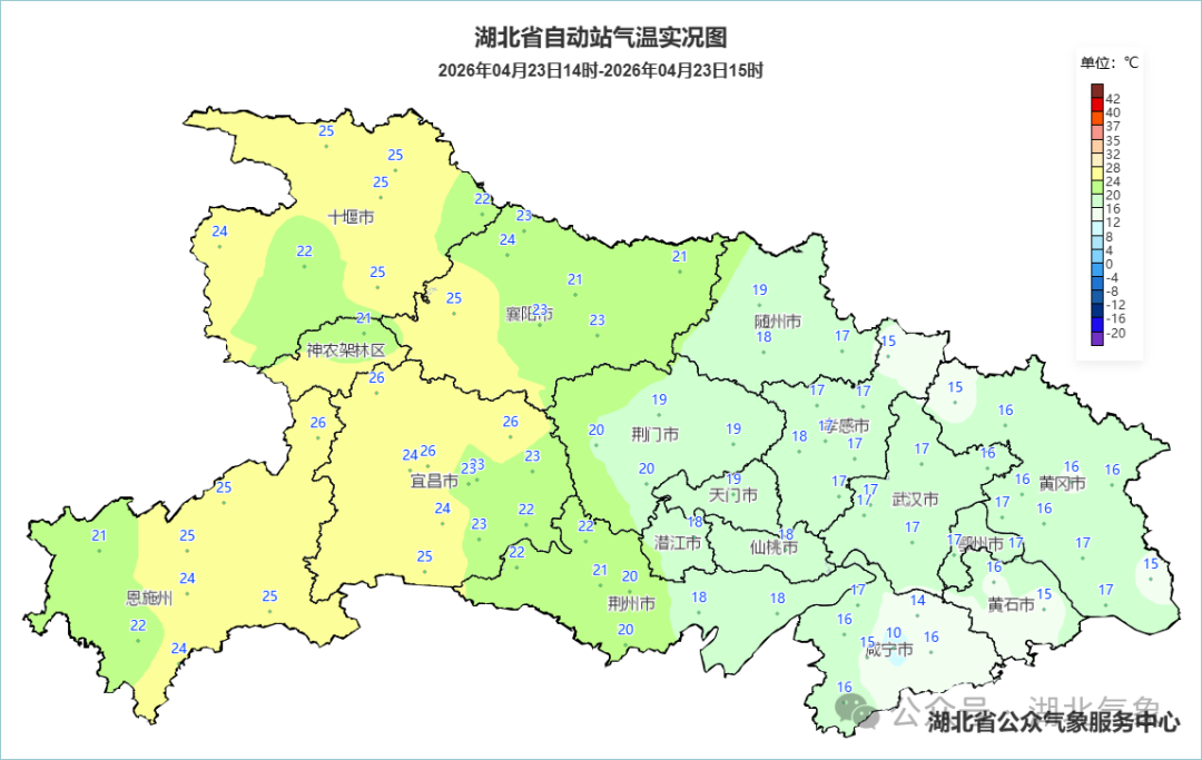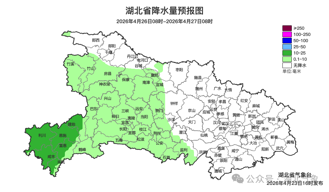 4月26日08时-27日08时,鄂西南多云转小到中雨,伴有雷电;鄂西北、江汉平原西部多云转阵雨或雷阵雨;其他地区晴天转多云。最高气温27~32℃,最低气温17~21℃,偏南风2到3级。