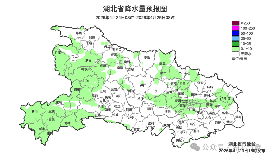 4月24日08时-25日08时,鄂西北南部、鄂西南多云有分散性阵雨或雷阵雨;其他地区多云间晴天,夜间局地有阵雨或雷阵雨。最高气温西部24~27℃、中东部21~24℃,最低气温10~15℃,偏东风2到3级。