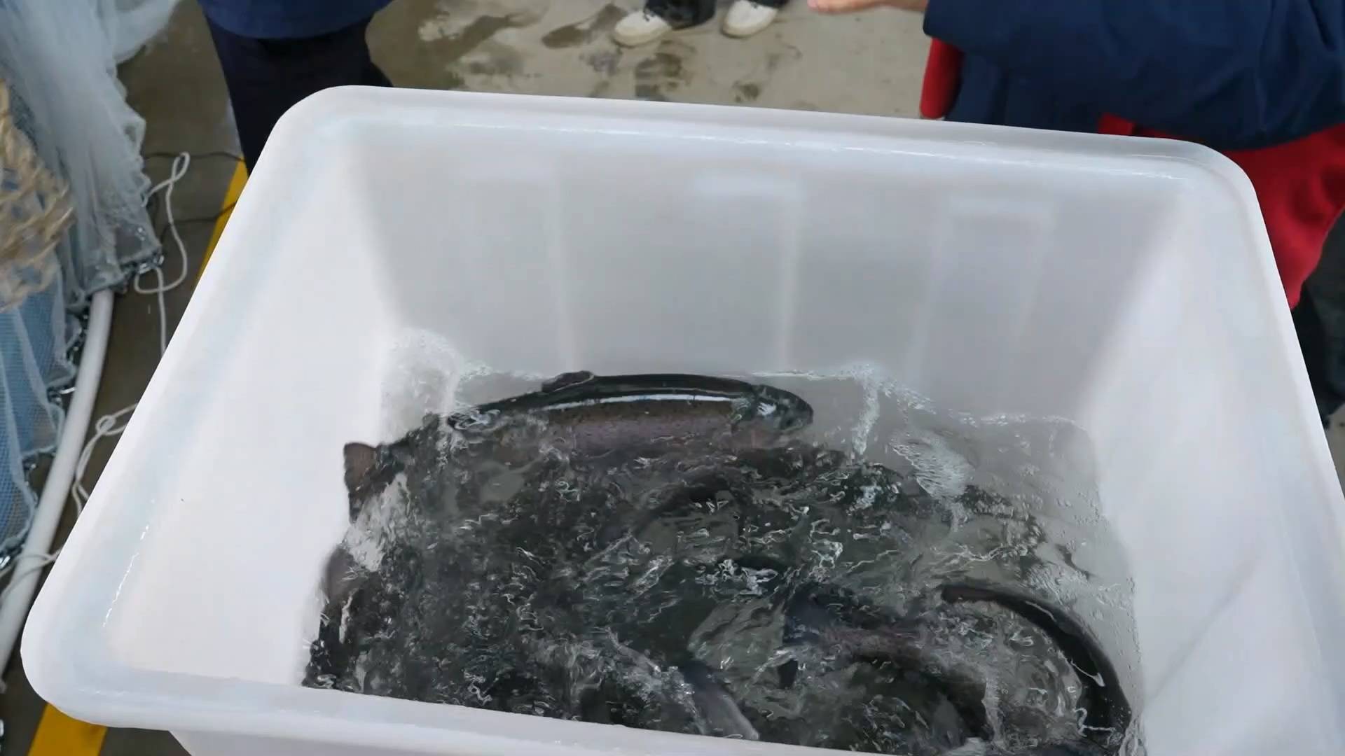 湖北农发渔业科技有限公司虹鳟养殖车间,200多个蓝色陆基圆桶整齐矗立,每年可产优质虹鳟鱼3000吨以上。大小不同的虹鳟放在相应养殖桶里,饲料直径长短标准都不同。技术人员坐在办公室通过数据监控平台可以实现水质在线监测、自动投饵。