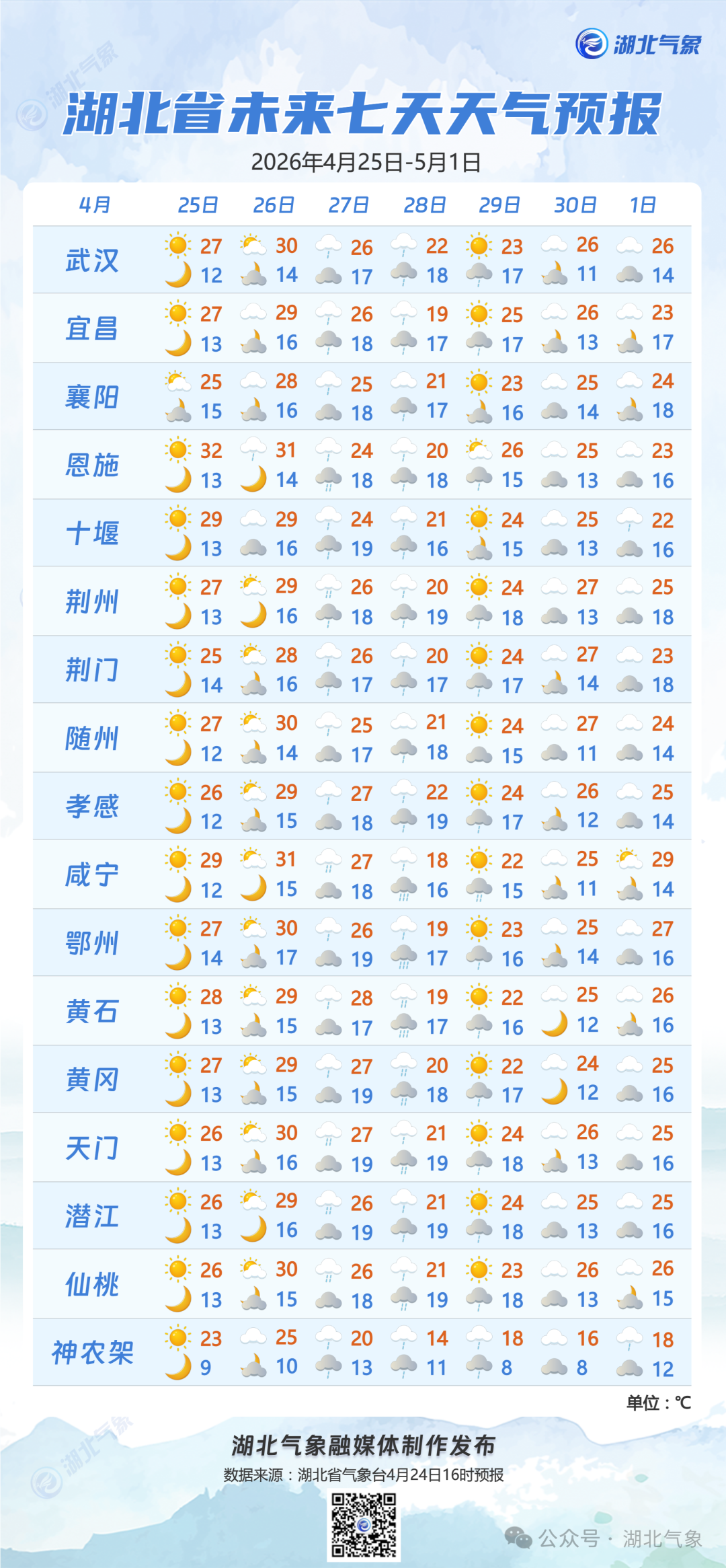 4月27日08时-28日08时,江汉平原南部、鄂东南多云转中到大雨,局地暴雨;鄂西北、鄂西南阴天有小到中雨,局地大雨;其他地区多云转小到中雨,局地大雨。省内部分地区伴有雷电。最高气温中西部20~26℃、东部26~29℃,最低气温15~19℃,偏东风2到3级转偏北风3到4级、阵风5到6级。