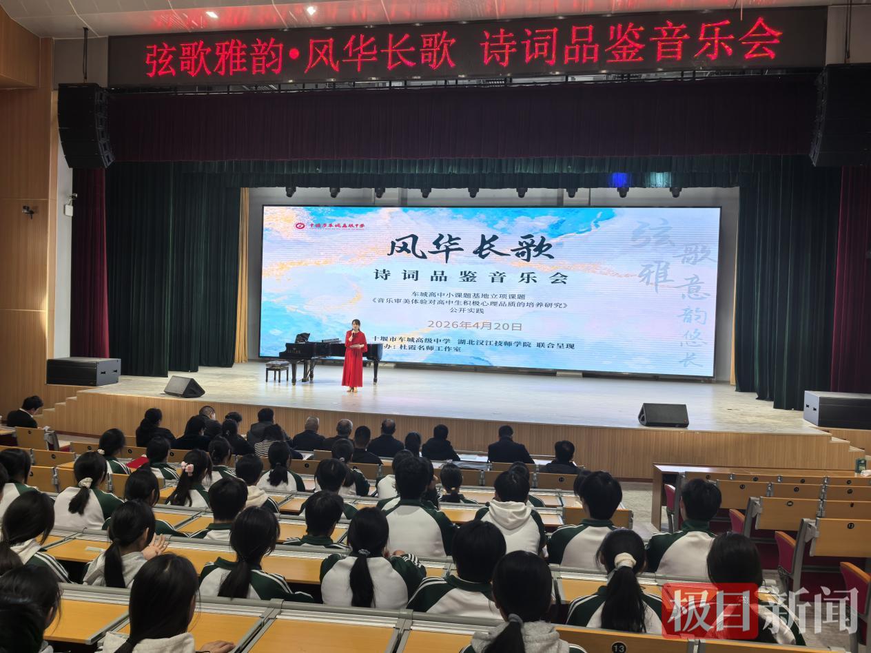 4月20日上午,十堰市车城高中演艺厅内,黑白琴键流淌千年诗意,“风华长歌——诗词声乐品鉴音乐会”温情启幕。本次活动由杜霞名师工作室主办,车城高级中学与湖北汉江技师学院教师联袂献演,车城高中校长乔宫、副校长曹剑波,湖北汉江技师学院党委副书记刘铭等领导及两校教师代表出席,150余名车城高中师生现场沉浸式聆听,在“不插电”的纯粹声场中,穿越千年触摸古典诗词的鲜活生命力。