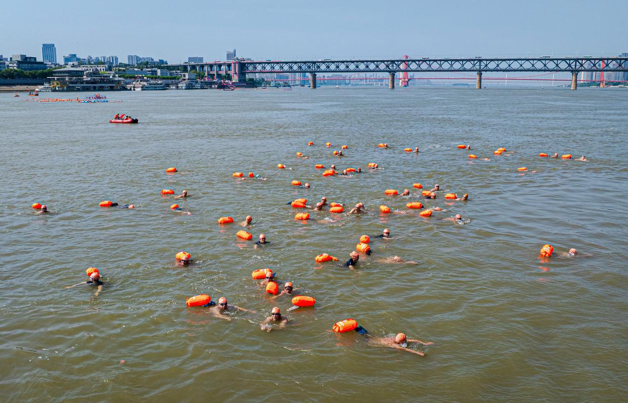 2025年7月16日,选手们横渡长江(无人机照片)。当日,第50届武汉渡江节在长江武汉段举行。新华社记者 肖艺九 摄