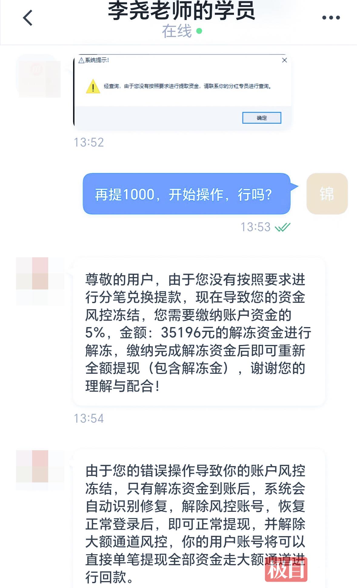 杨先生支付3万元后,试着提现500元,不到10分钟便到账了。他大喜过望,随即申请提现1万元,结果系统显示“机构审核不通过”。李尧解释称,需再交3万多元,系统才会自动解锁,这笔钱会随收益一并返还。