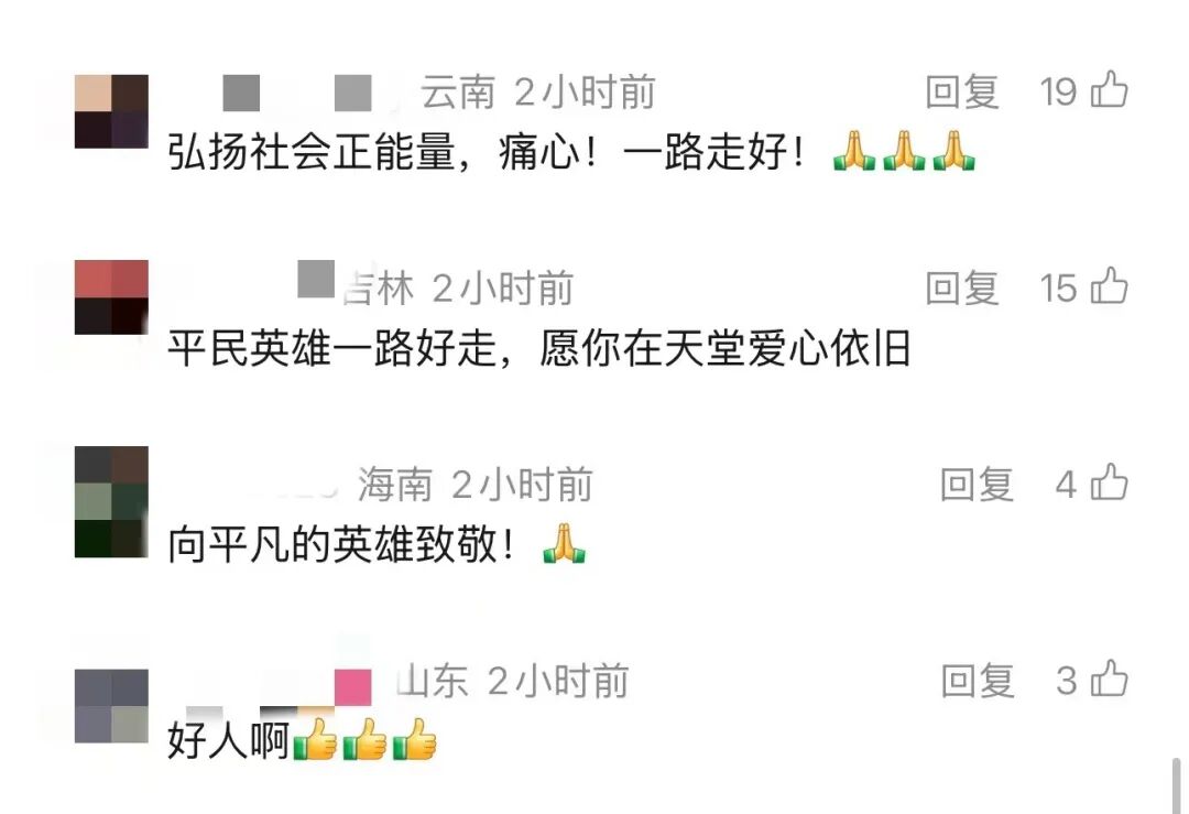 “英雄一路走好!用生命谱写大爱与正能量”“平凡世界的勇士,一路走好”“英雄的一生短暂却明媚”
