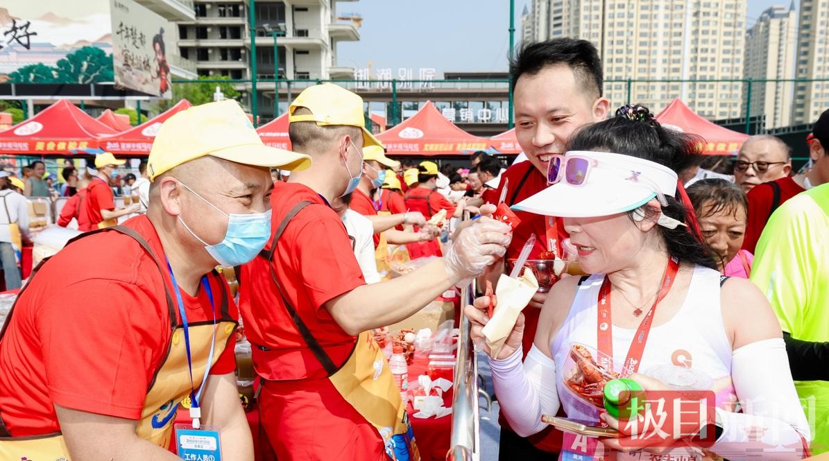 赛事的温情更体现在终点的烟火气里。美食区内,宜城大虾、糖锅烙、盘龙鳝、卤鸡蛋等地道风味免费供应,配上不限量的绿豆汤,完赛选手们大汗淋漓后捧着碗吃得格外酣畅。现场还设置了24道名菜展示区,不少跑者边吃边拍照,直言“跑完一场马,认识一座城”。组委会还联合33家本地餐饮商家推出了跑友专属福利,让选手在赛后能继续品味炸子鸡、盘龙鳝等宜城味道。广东来的跑友告诉记者:“到宜城跑步不枉此行,免费吃到宜城大虾,太好吃了。回头还要再去当地品尝美食。”