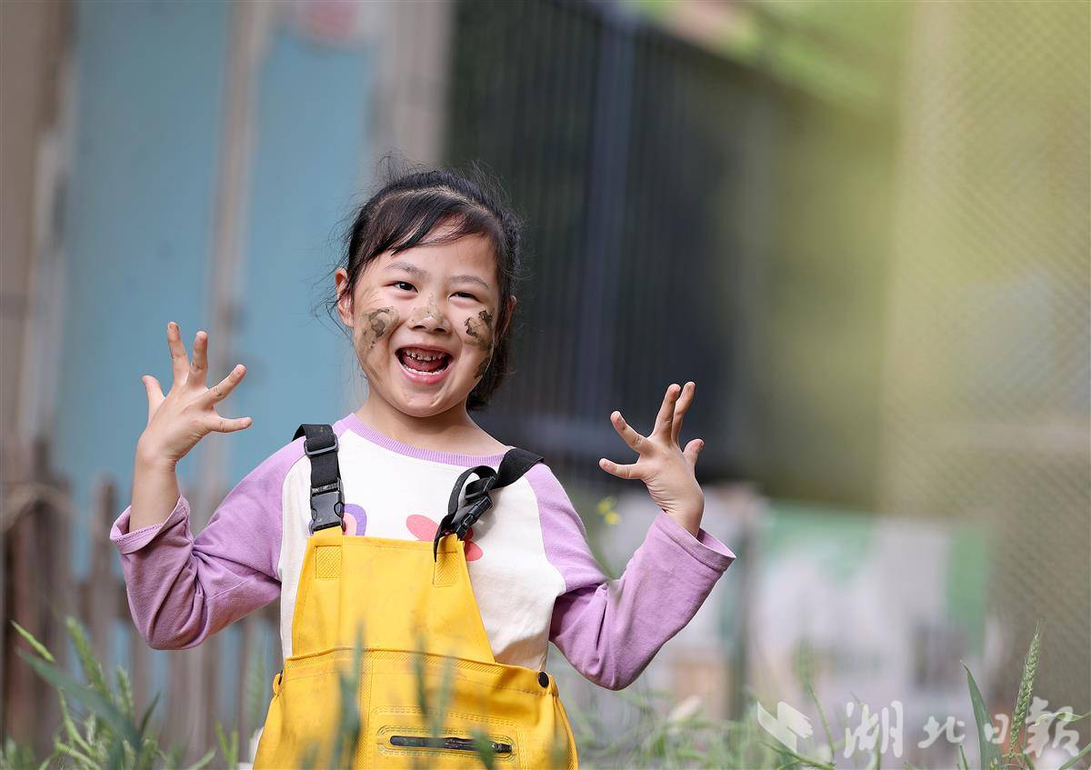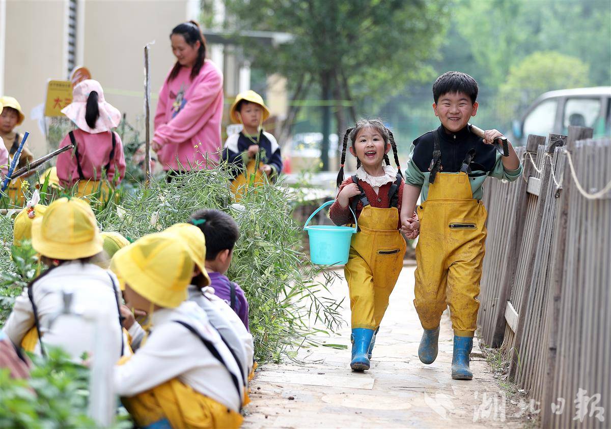 4月24日,在荆门市东宝区长宁实验幼儿园种植园里,孩子们在老师带领下体验翻土、播种等田间劳作的乐趣。