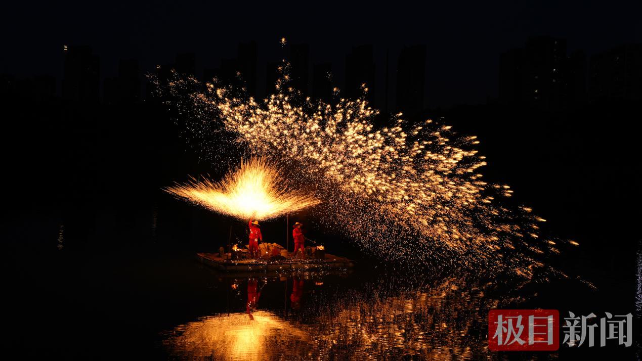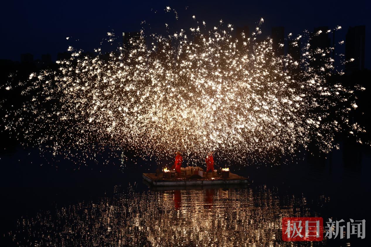 本次活动重磅推出水面打铁花非遗首秀,成为最震撼人心的亮点环节。作为国家级非物质文化遗产,打铁花技艺以1600℃高温铁水凌空挥洒,迸发出漫天星火,宛若星河倾泻、火树银花。璀璨铁花与槐荫船说湖面夜色交相辉映,水光、火光、灯光交融共生,构成一幅气势恢宏、美轮美奂的水上光影画卷。