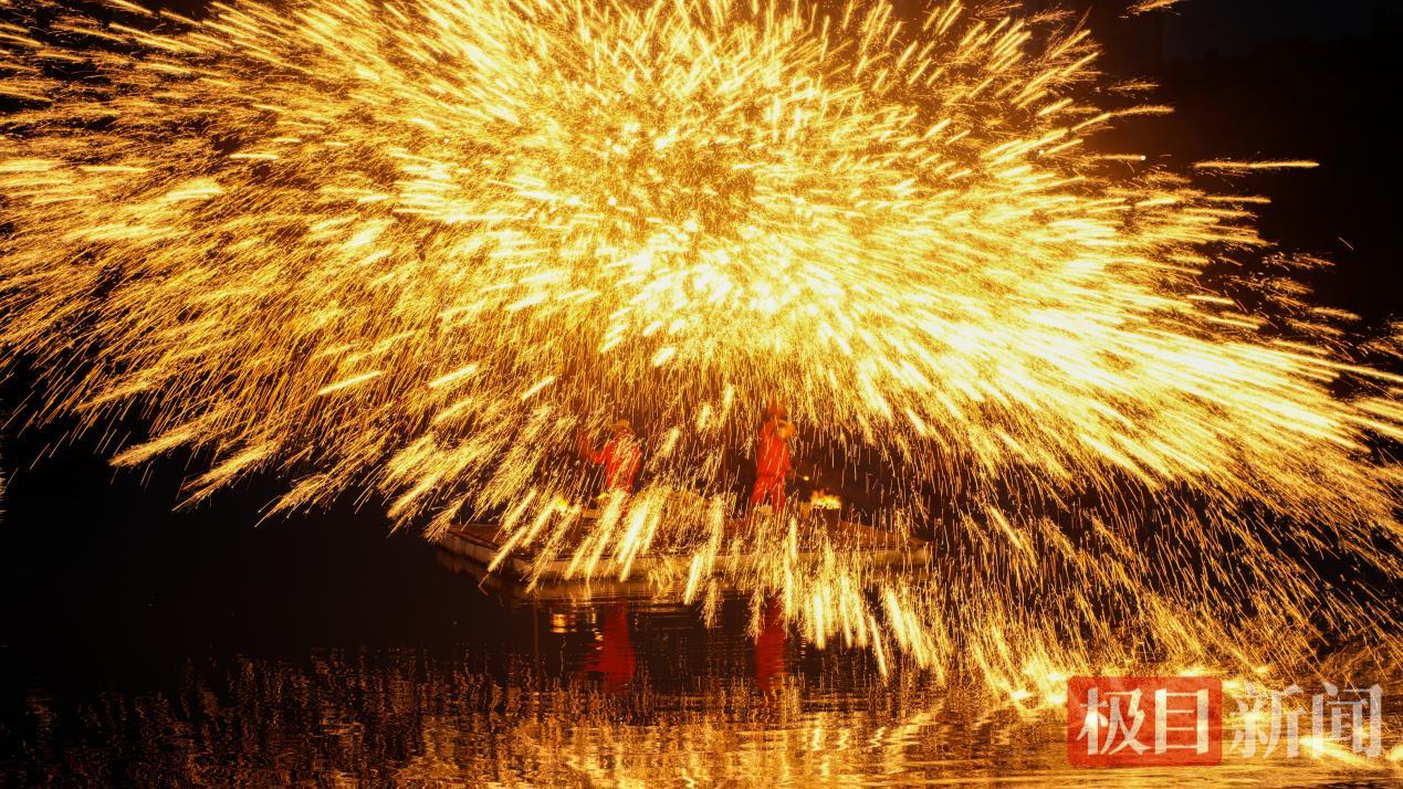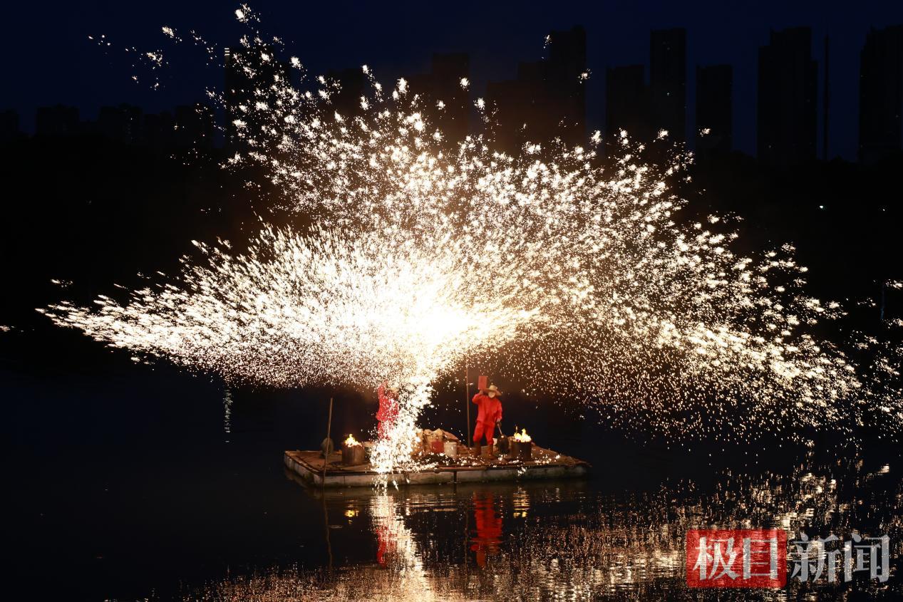 飞溅的铁花如流星坠落,似金龙腾飞,古老非遗技艺在澴川河畔焕发出全新生命力,现场观众纷纷驻足观看、拍照记录,惊叹声与喝彩声此起彼伏。不同于传统地面表演,此次水上沉浸式打铁花依托槐荫船说独特水域环境,视觉效果更具层次感与冲击力,让市民游客近距离感受传统文化的磅礴气势与独特魅力。