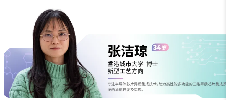 张洁琼积极响应国家重大战略需求,从海外回国,投身国家第三代半导体领域研究。作为实验室异质集成平台项目经理和技术总工程师,她牵头九峰山实验室内部芯片异质集成技术前沿研发项目,积极组建并带领工艺研发团队专注于三维异质异构芯片集成技术开发,带领研发团队成功搭建先进的异质集成键合工艺平台,并通过持续技术创新,开发出针对多材料大尺寸跨纬度的多种低温异质集成键合工艺技术,并取得全球突破性技术成果,为实现国内产业界低成本的硅基光电子集成及片上光互连芯片奠定了技术基础。