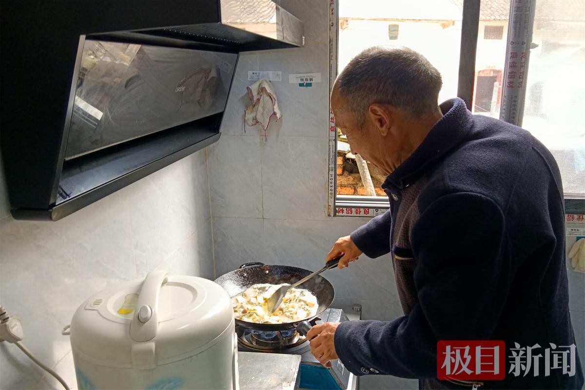 61岁的童德生忙碌着为卧床的105岁继父谭光伸做饭