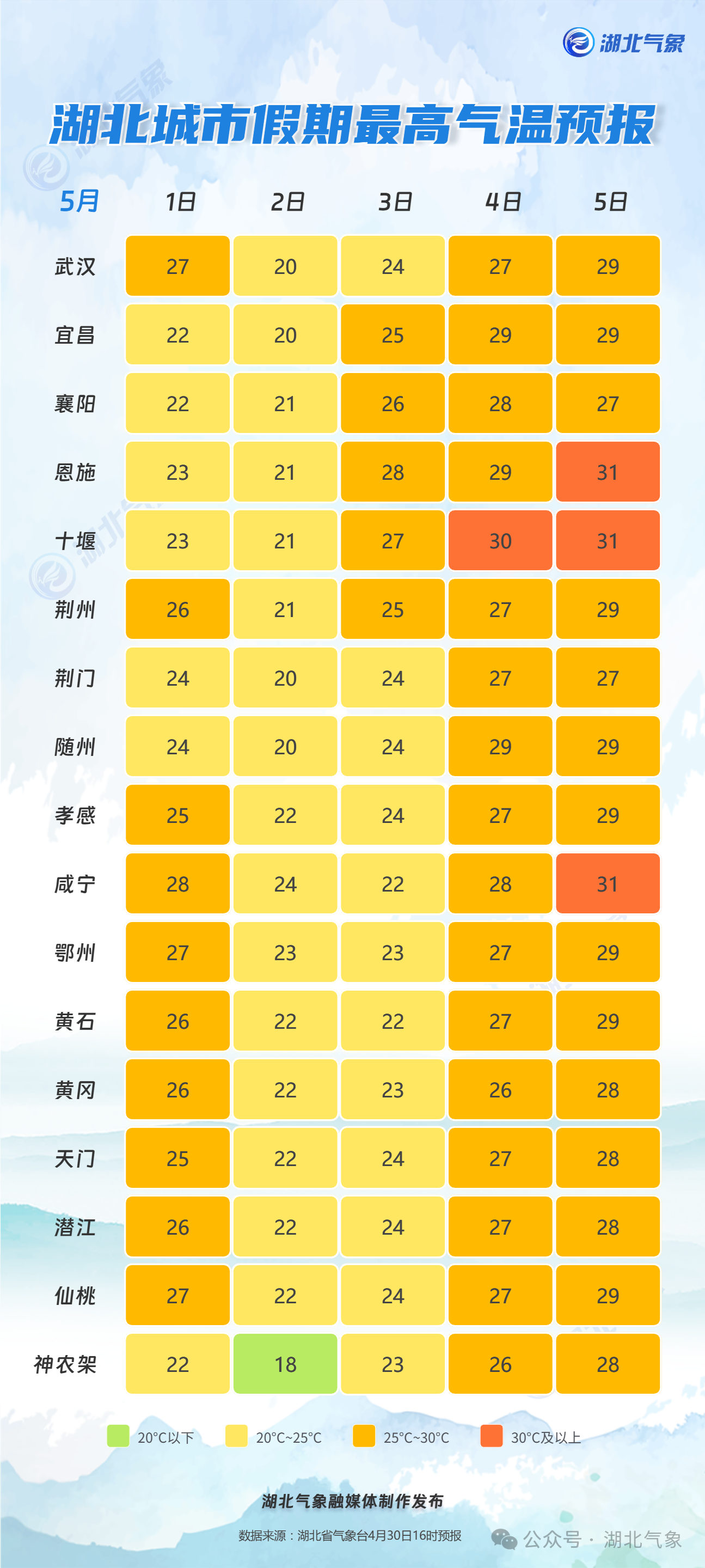 整体来看,今年“五一”假期湖北晴多雨少,气温先降后升,整体适宜外出及返程。具体预报为:4月30日至5月1日白天,全省维持晴天到多云,5月1日早晨中东部局地有雾,假期一早驾车出行的市民需注意交通安全;1日夜间至2日,全省自西向东有小到中雨,鄂东南局地大雨伴雷电;3日至5日,全省转为多云到晴天,非常适宜假期外出及返程。气温方面,4日至5日各地最高气温将升至25~30℃。